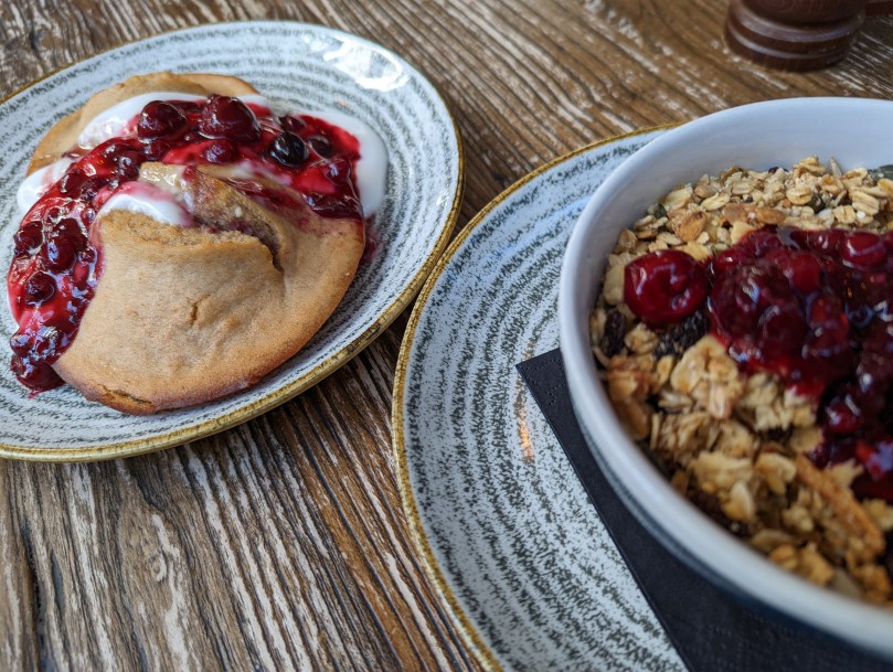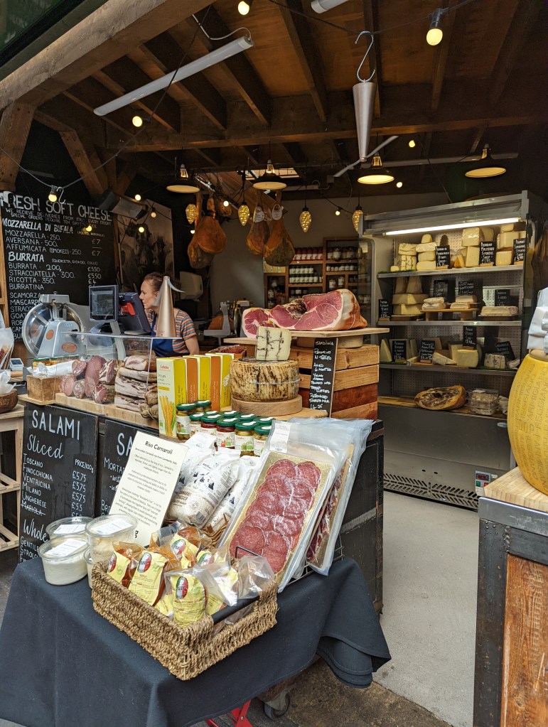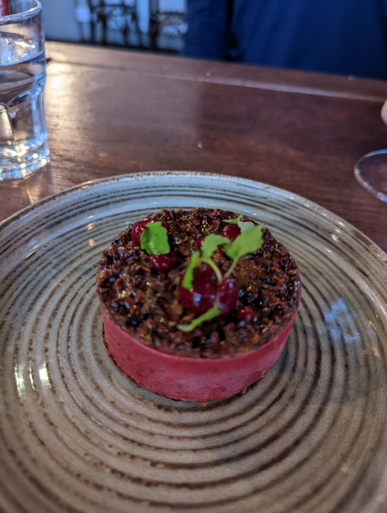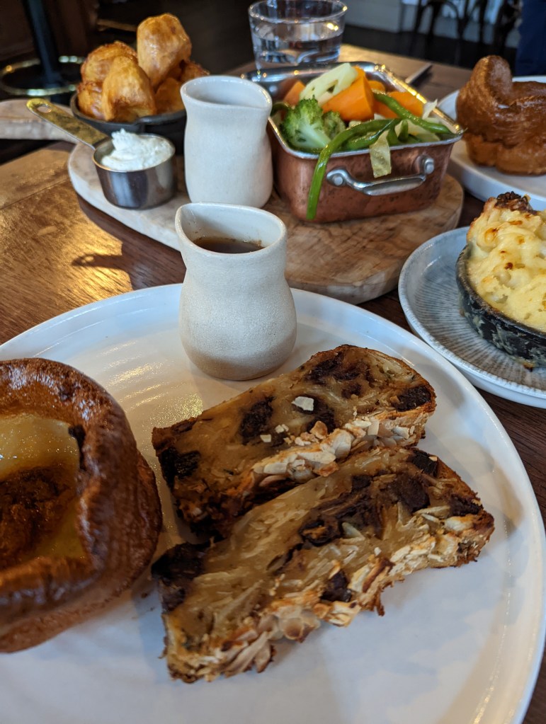 And dinner….I am obsessive about chicken in the UK. It is so, so much better than chicken in the US. And the very best I ever had was at the Princess of Shoreditch. Alas, it is so yummy it is almost always sold out by the time we arrive, and yesterday was no exception. I decided to try a vegetarian option this time, called Almonds and Dates. It turned out to be kind of like sliced bread stuffing. It was good, kind of strange. Also had a cold pea and mint soup. That was yummy. And roast always comes with Yorkshire pudding, my favorite part of the whole experience. I topped it off with a cherry ice cream sandwich.