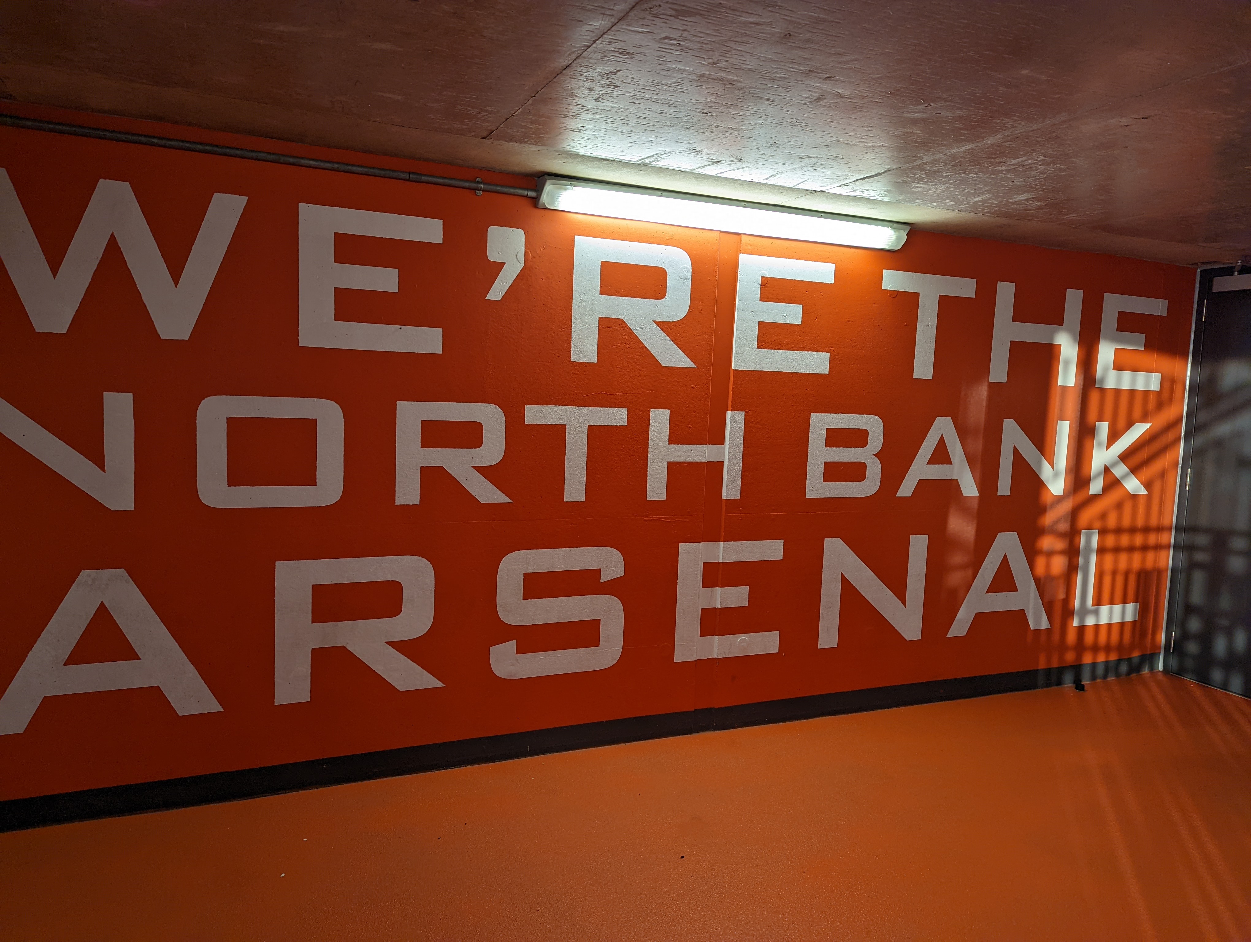 We met a fellow Arsenal fan friend for dinner before the match and walked to the stadium afterward. Fun to walk among all those fans. Looking at the fellow walkers, it was abundantly clear that the 2022 merchandise is very, very popular. At first I was not a very big fan of the home jersey (it has a collar, which seems strange, a bit nerdish and not fearsome). It’s been growing on me. And the 3rd, pink jersey…..when I first saw it I was all “no way, what were they thinking?” And after two matches played in it, and seeing many local fans in it, I am all “where can I buy this?”