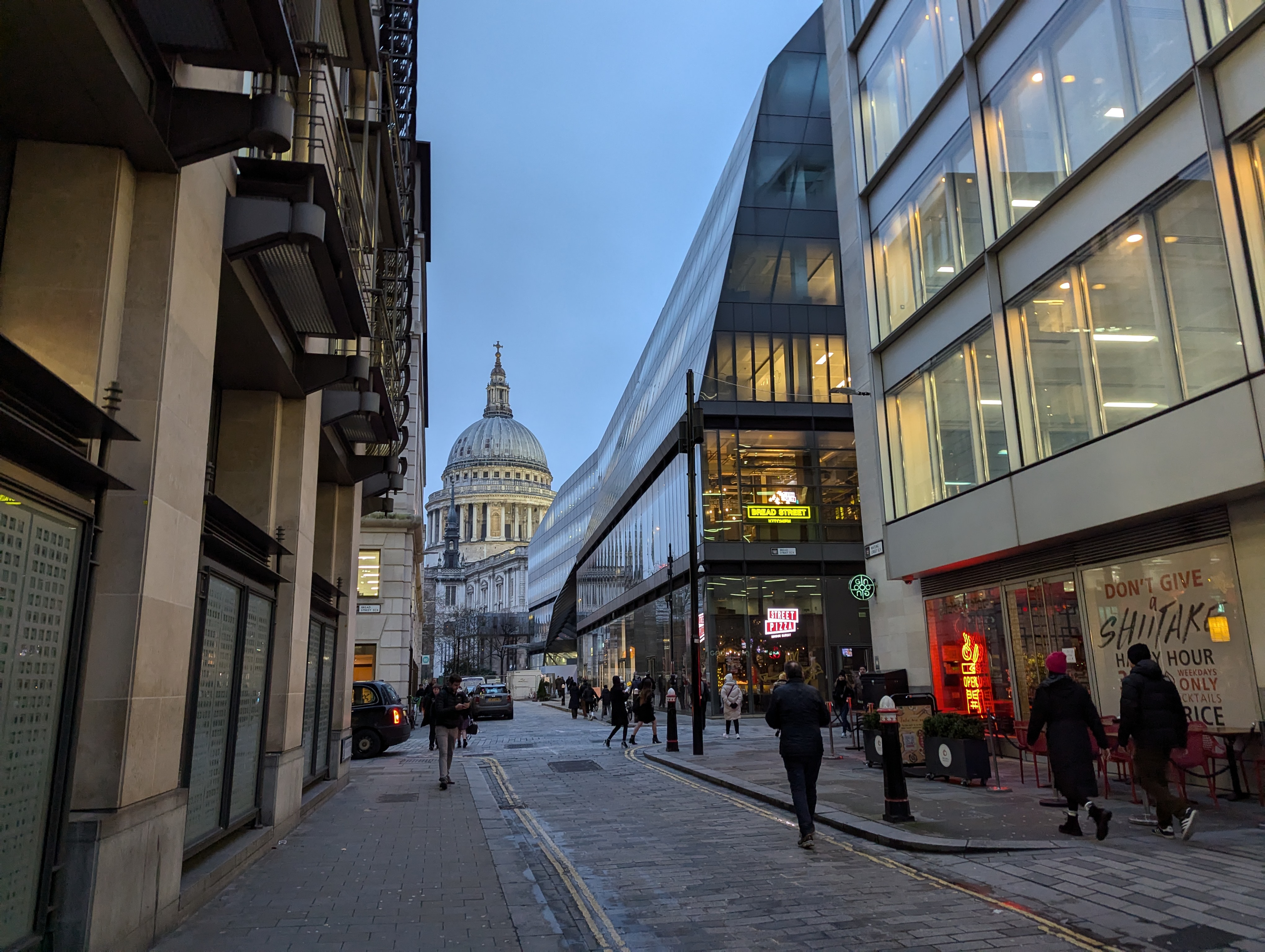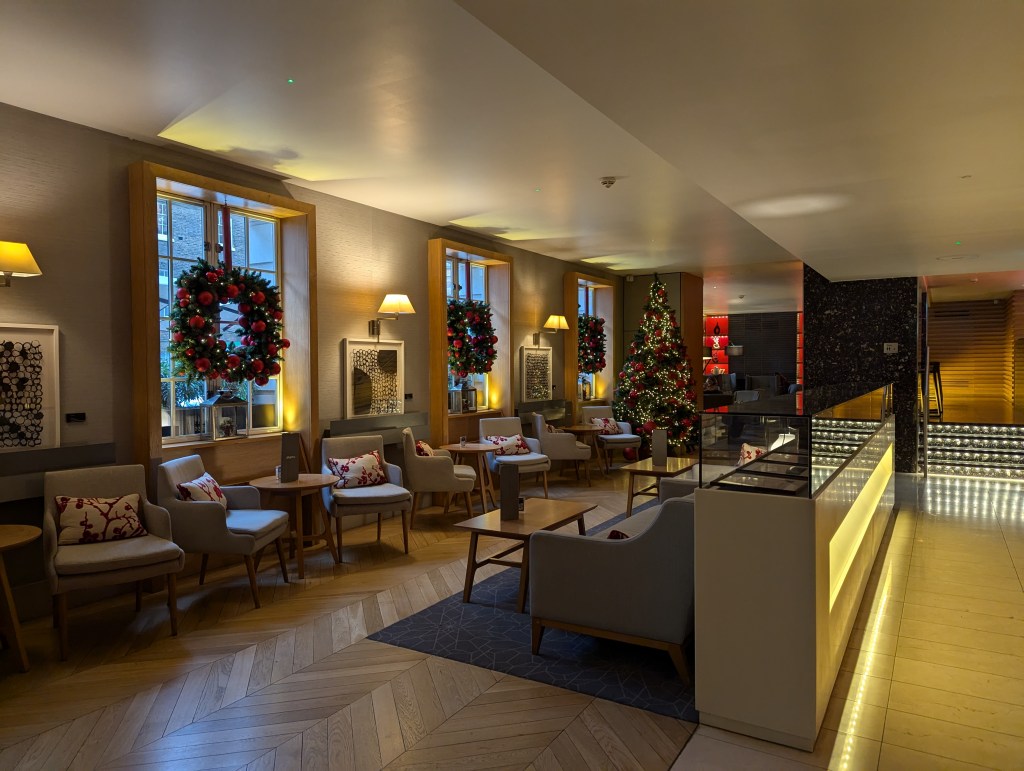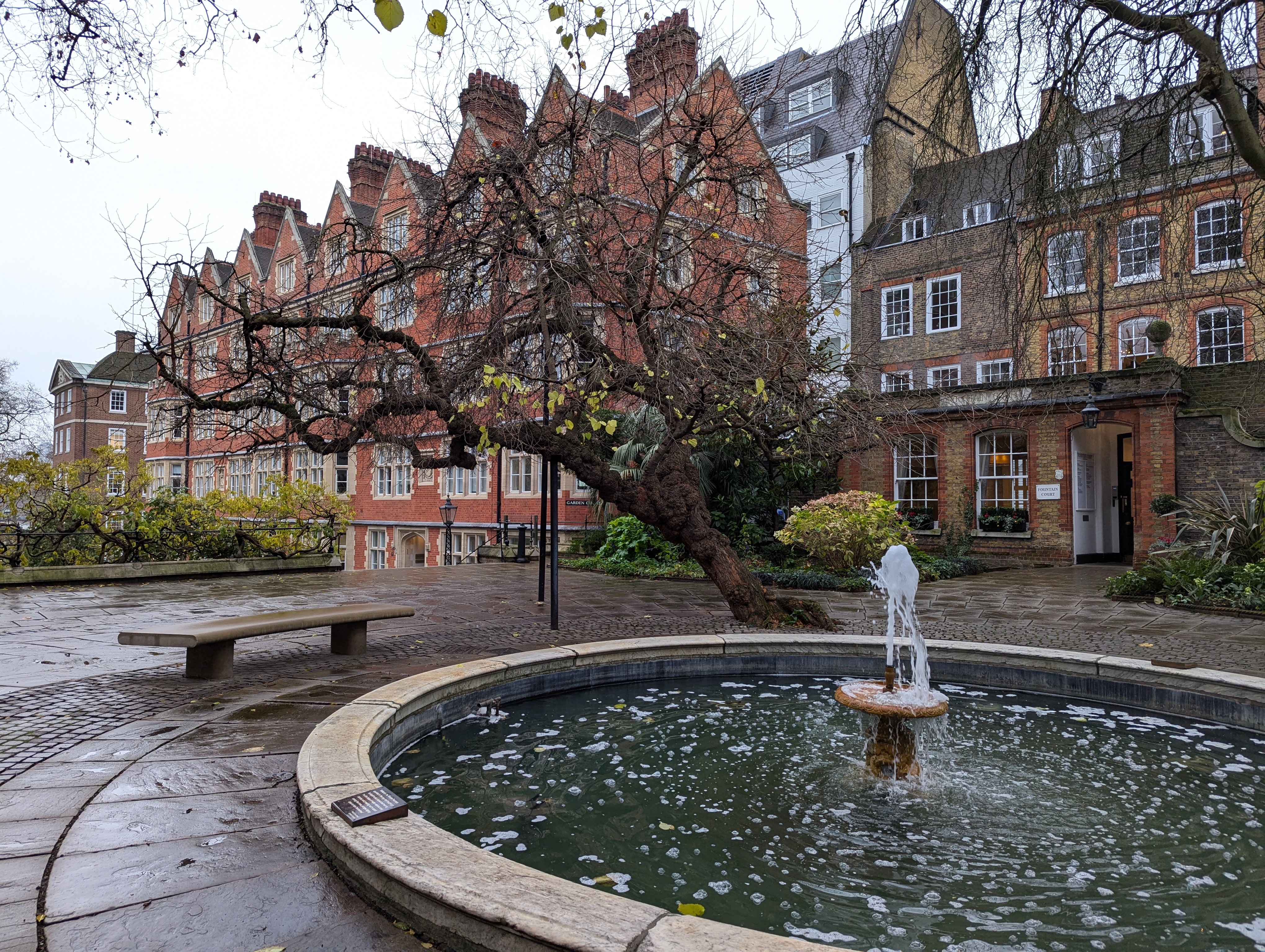 We enjoyed our new hotel neighborhood near the Temple tube stop. Walking from the Tube stop to the hotel, the area felt like no place we had ever stayed in London even though it was relatively close to other areas we’ve stayed in. Every time we were walking around I was hit with the sensation of novelty which would morph into familiarity and back into novelty. Our hotel was the Apex Temple Court, which had a lovely lobby and pretty, spacious, and practical rooms. The hotel was serving mulled wine and tiny mince pies near the reception desk. Mulled wine = fabulous. Mince pie = not my thing. Mince pie was ubiquitous in London. But so was mulled wine.