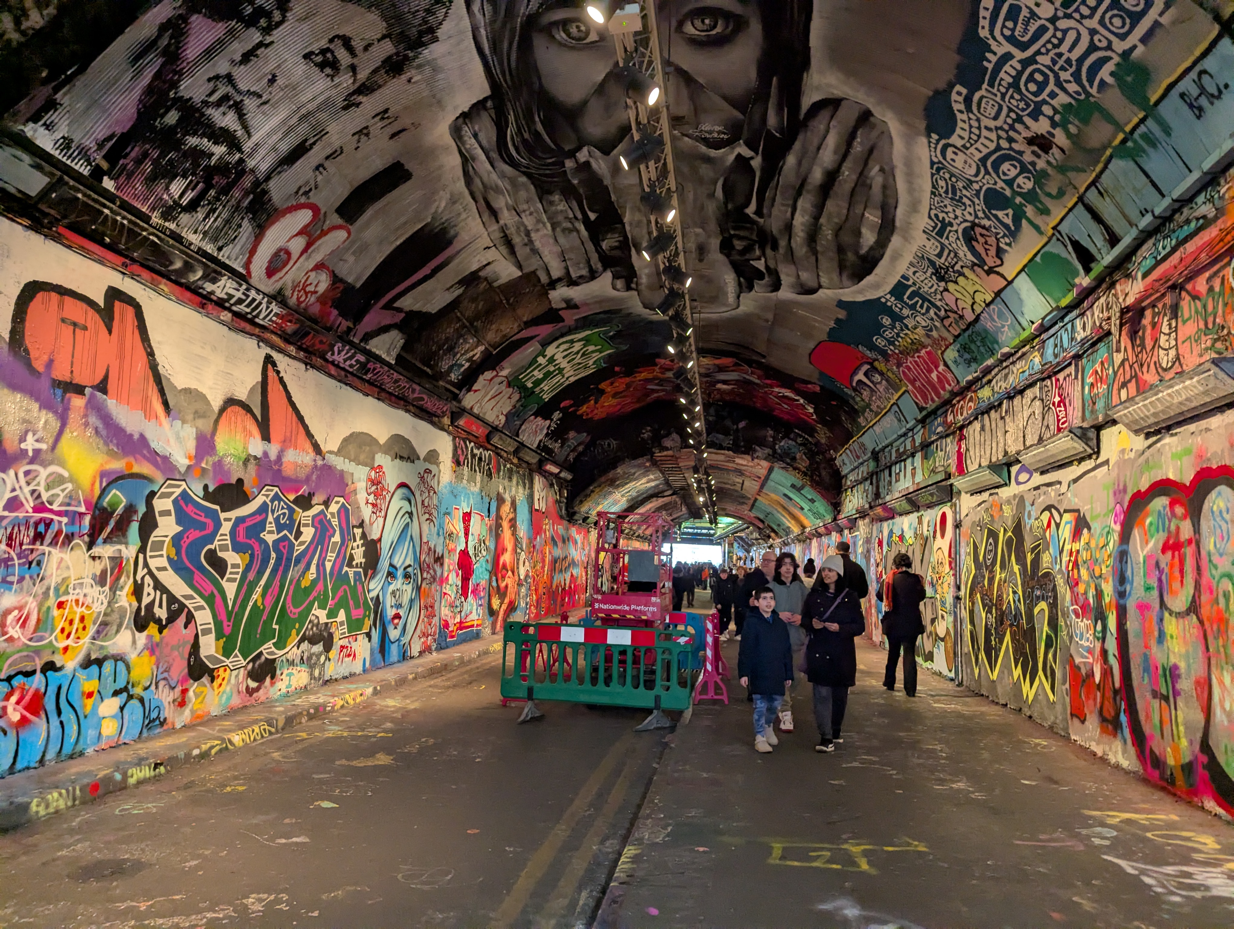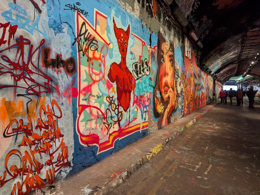 One of the cooler things about the neighborhood was an attraction I’d never heard of before, Leake Street Arches. We had been walking down Lower Marsh Street waiting for our hotel room to be made up when I noticed a garden path leading to what looked like an underground tunnel. Inside was a broad arch covered with some of the coolest graffiti I’ve ever seen. According to the web site, “London’s largest legal graffiti wall.” An artist was working on some fresh art with a can of spray paint.