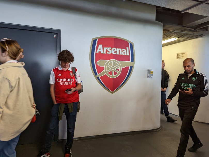 My husband and I normally meet after the match at the Arsene Wenger statue. I got confused with the unusual set-up of my section and headed the wrong way out of the stadium. It took me forever to figure out my mistake. So long, and with crowds so thick. it just made sense to keep walking. It was raining again and when I arrived my husband was waiting under building near the statue.