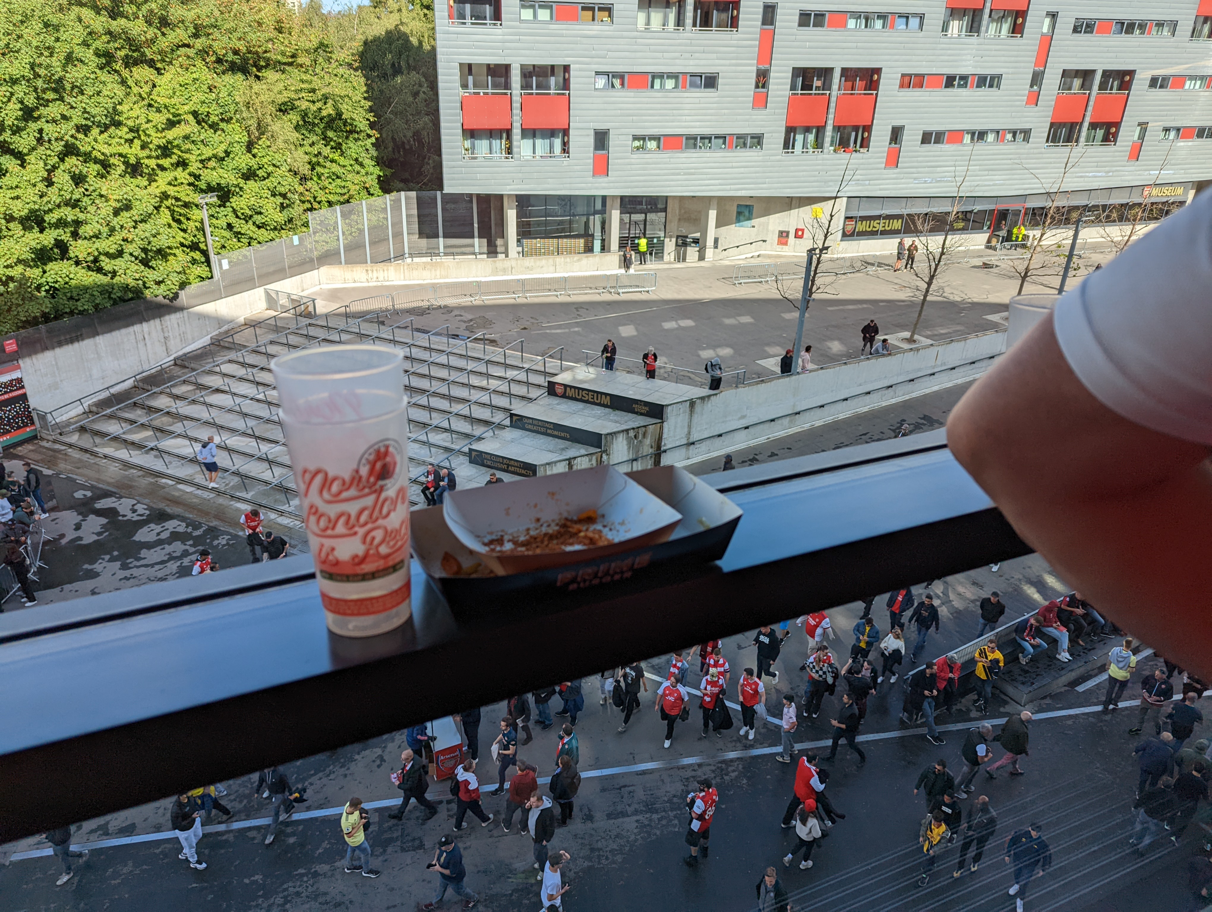 At halftime I went to concessions and stood in a long line of people getting beer and ultimately picked up a cup of tea. One of the beers Arsenal is now serving at the stadium is Guinness. It takes a long time to pour a Guinness–I wonder if they regret that? The lady next to me complained fiercely to me about the inefficiency of the process of serving beer. Beer is available at no added charge to those in Club. Ergo, a lot of people want one. I appreciated her decision to read me into her frustration and nodded sympathetically, even though my empathy was not really piqued.