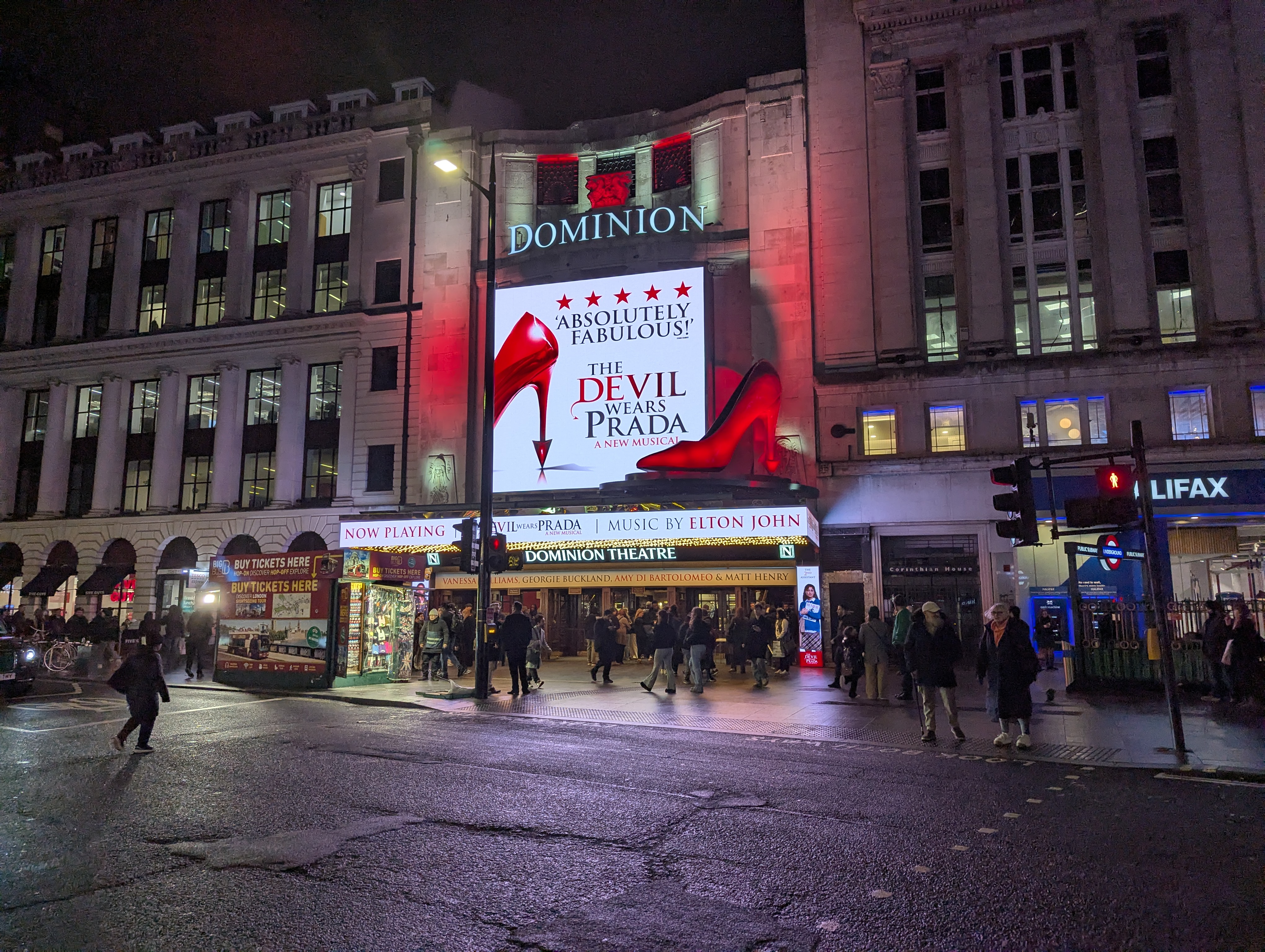 Breaking our supposed rule never to see a play on the first night we arrive in London, we located reasonably-priced tickets to Thursday’s production of the musical The Devil Wears Prada. It was easy to break because, as evidenced by even events in the dark on the last night of a trip to London, I still seem to be able to sleep through parts of any production.
