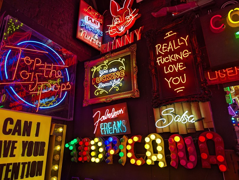 That afternoon we took a long train ride to a different kind of exhibit, God’s Own Junkyard. This is a museum of neon signs, many created by one artist, Chris Bracey, who sadly passed away in in 2014 due to cancer. You can walk through the museum and see the works of neon art displayed and there’s a little coffee shop to sit and enjoy them while relaxing. It is very cool, and very overwhelming.