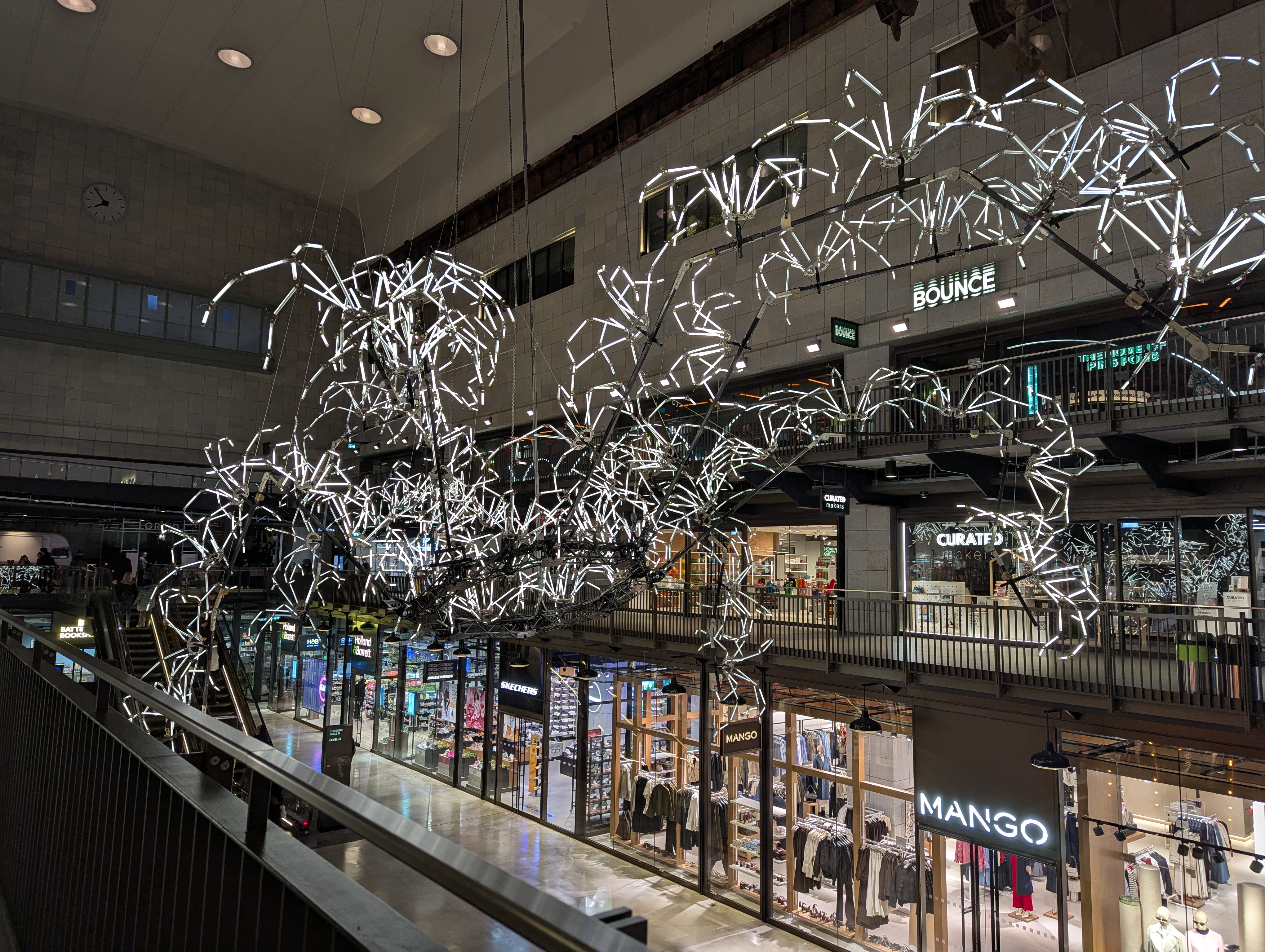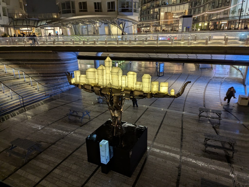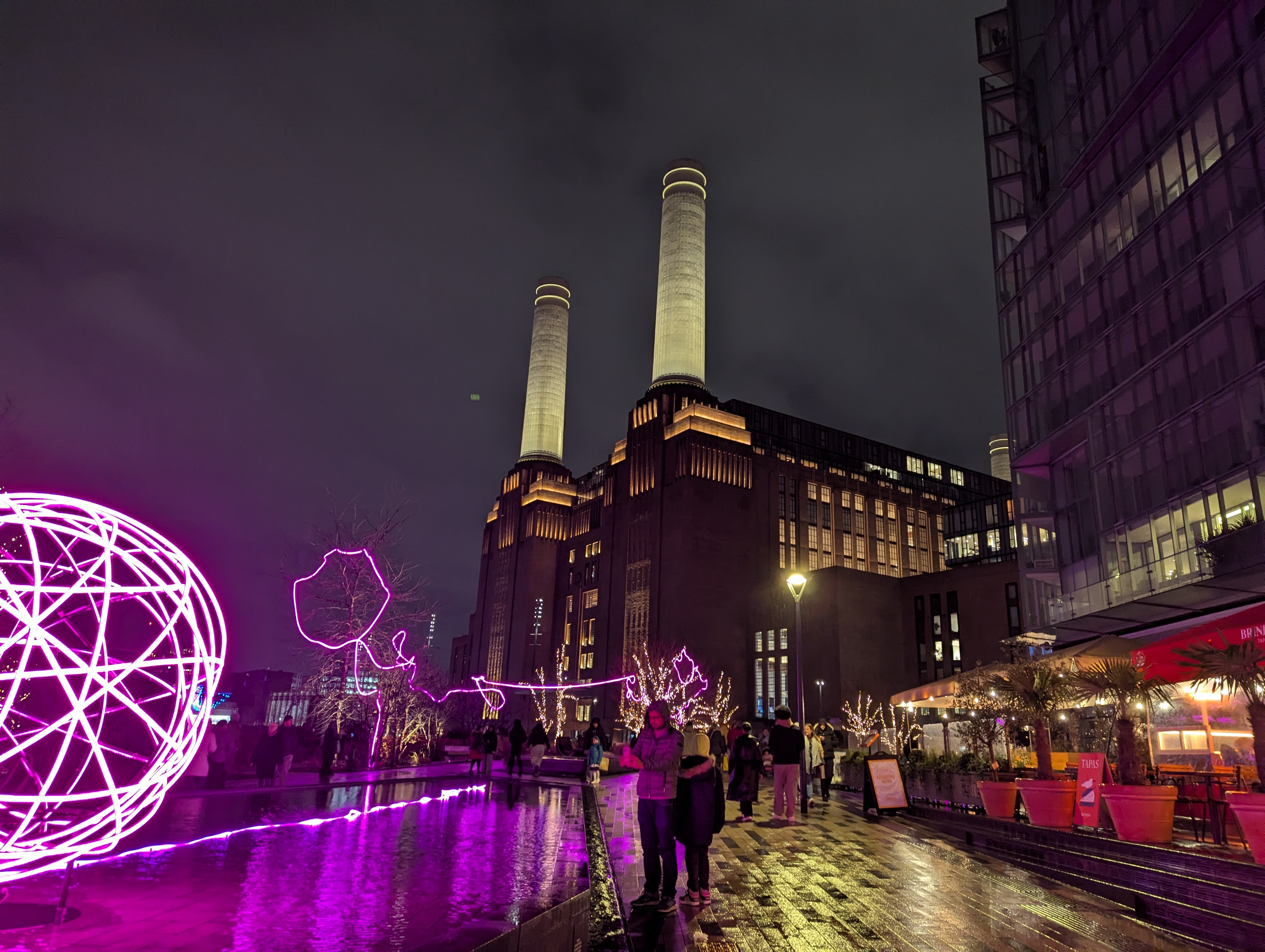 Later that day we went out to Battersea Power Station to view installations for the Light Festival. Battersea Power Station was formerly a literal source of electrical power for London that had been closed down in 1983 and much later converted to a very fancy mall. The light festival was a little, well, little, eight installations from very awesome to kind of ho-hum. But the mall….I am not a shopper but it was beautiful. I especially loved that they retained the old towers from the original building when they built the mall. It’s also full of old equipment from its past as a power station. There is an unbelievable amount of housing development around the mall. One of the reasons I love visiting London is the juxtaposition of old buildings to new, modern ones. This area was all new, but it was all awesome.