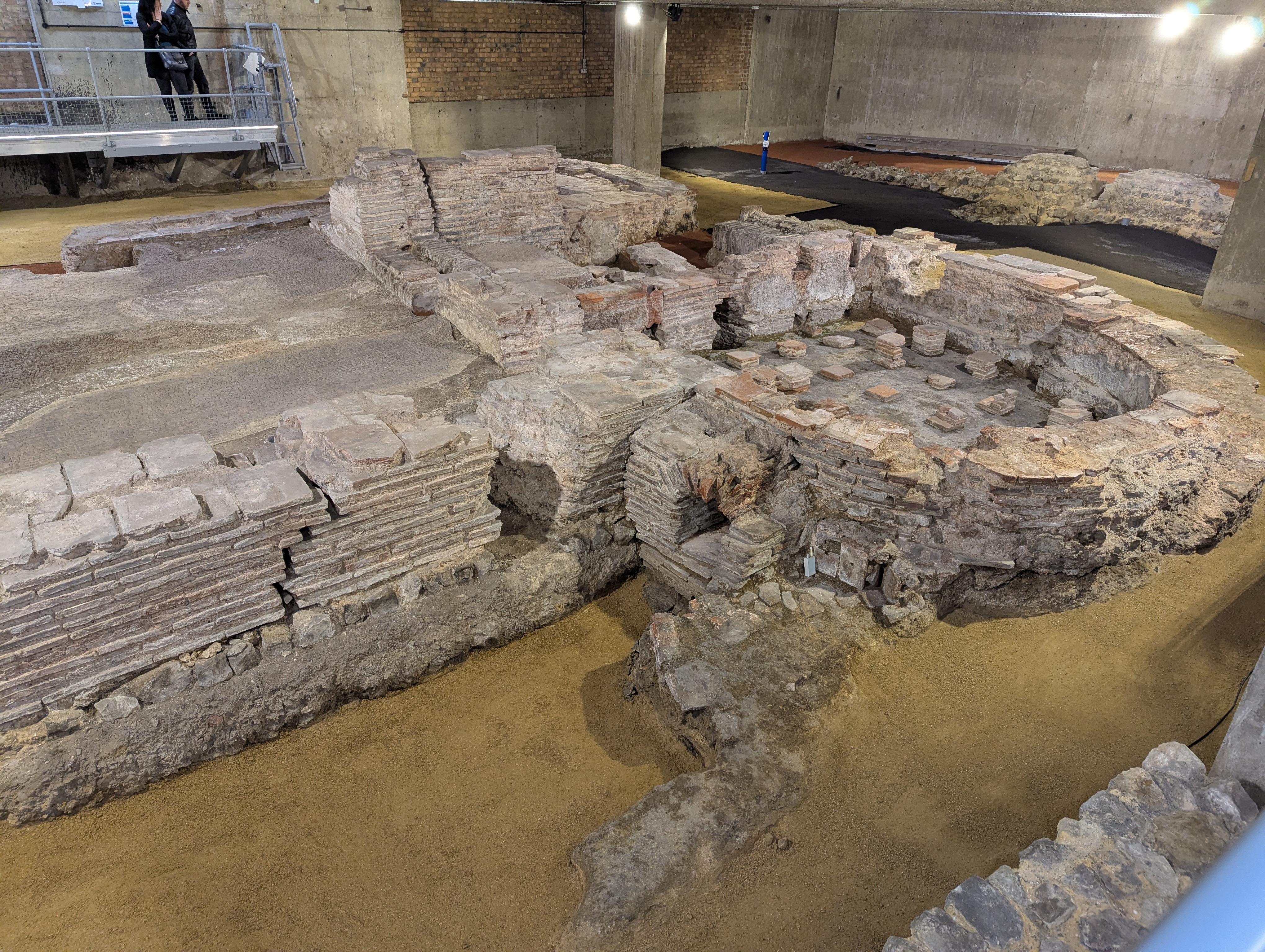 We had scheduled a tour of the ruins of Billingsgate Roman House and Baths for later in the morning. That was pretty cool. Romans occupied parts of what became London starting in the first century AD. They built homes that ultimately were built on by others, layers and layers of people building over centuries. As people now renovate in London, they sometimes find remnants of Roman life under the surface. This particular archeological find of parts of a Roman home with a Roman bath is under a nondescript office building. We took a guided tour of the site given by City Guides. The bath is largely intact and you can easily visualize the three rooms. So clean and perfect it almost looked fake. I enjoyed the tour very much.