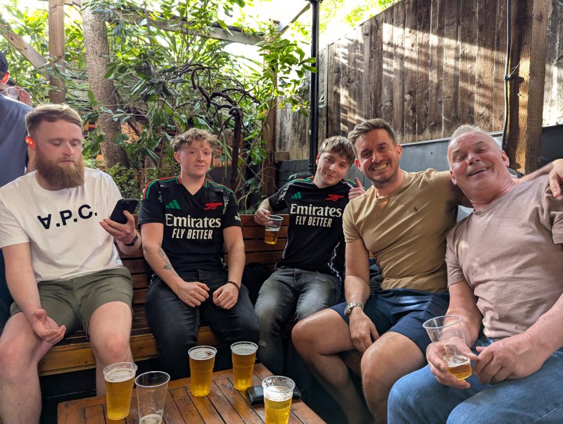 It was just about time to head over near the Emirates. We were early enough that we decided to visit an Arsenal-friendly pub called The Bank of Friendship. It’s not really a Fuller’s pub but it does have London Pride, my husband’s weakness. The pub was packed with Arsenal fans. We’ve been to this pub before but never before have seen the very nice beer garden. As I walked into the garden I was invited to sit with a group of Arsenal fans. They were a mix of ages, all guys, and I mistook them for a family. But it turned out they were connected by loose friendship and Arsenal kinship to one of the guys. Some of them had only met that day. About that time the lineup for the Arsenal match had come out and we commiserated together about that. As expected, Arteta planned to put out an unusual team, including Thomas Partey at right back, not his best spot. Martin Odegaard, Mikel Merino, and Bukayo Saka were all listed as substitutes. Ben White, only recently returned from a lengthy injury was no where. With our new friends we also had the requisite conversation about Donald Trump.