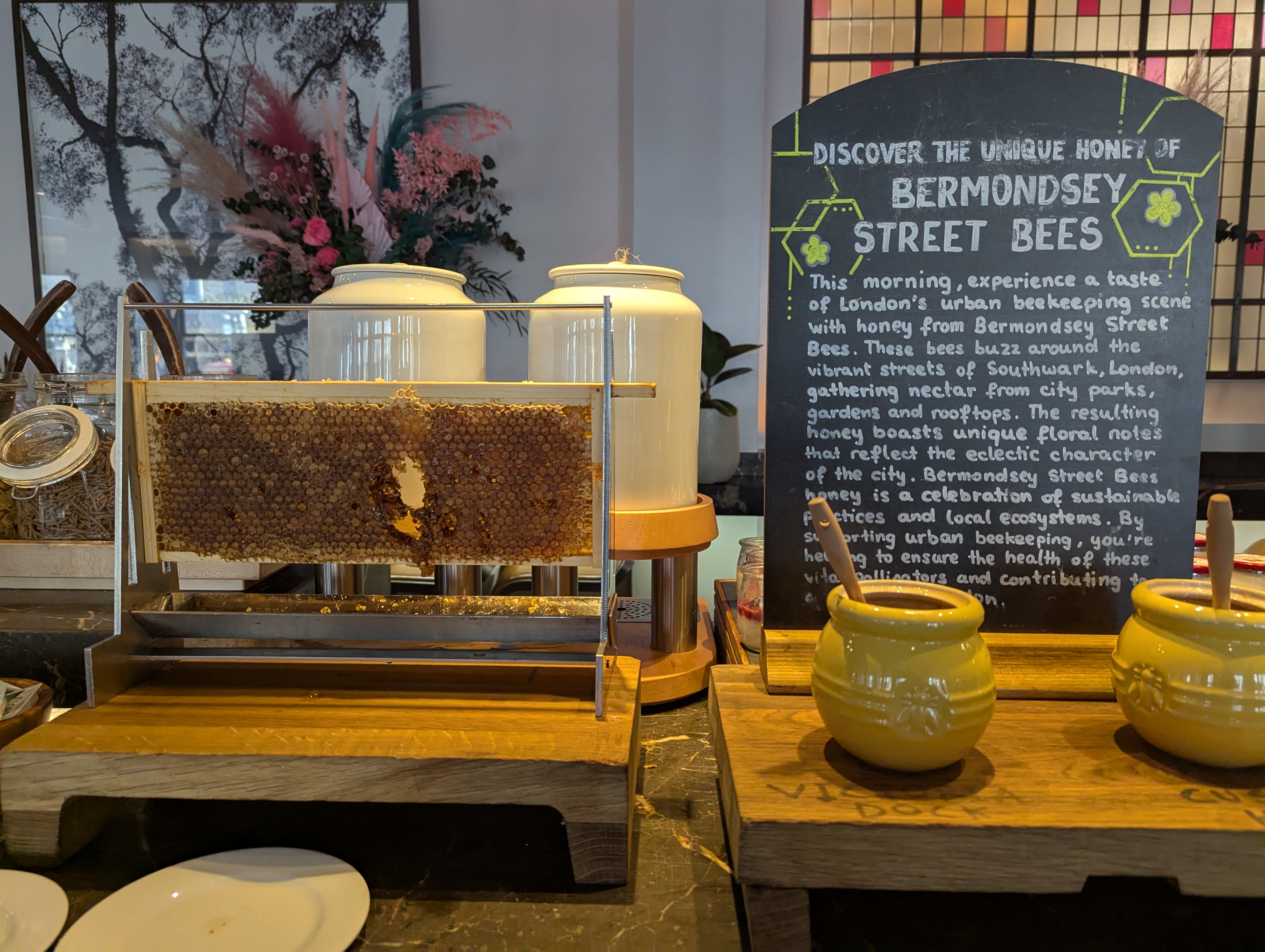 We stayed this time at the Andaz London, a very nice hotel on Liverpool street that briefly came into our price point during this trip. On only one other occasion while visiting London was breakfast included in the price of the room, but the Andaz’s breakfast had such interesting and extensive options I feel like I want to pay more attention to this feature when selecting hotels in the future. Although it’s fun finding new places to eat for each meal, it was very relaxing to start the day in our own restaurant and fun to try the many different options they offered. For example, salad. Charcuterie. Also the usual stuff–toast, croissants, waffles, eggs, smoothies, fruit, yogurt.