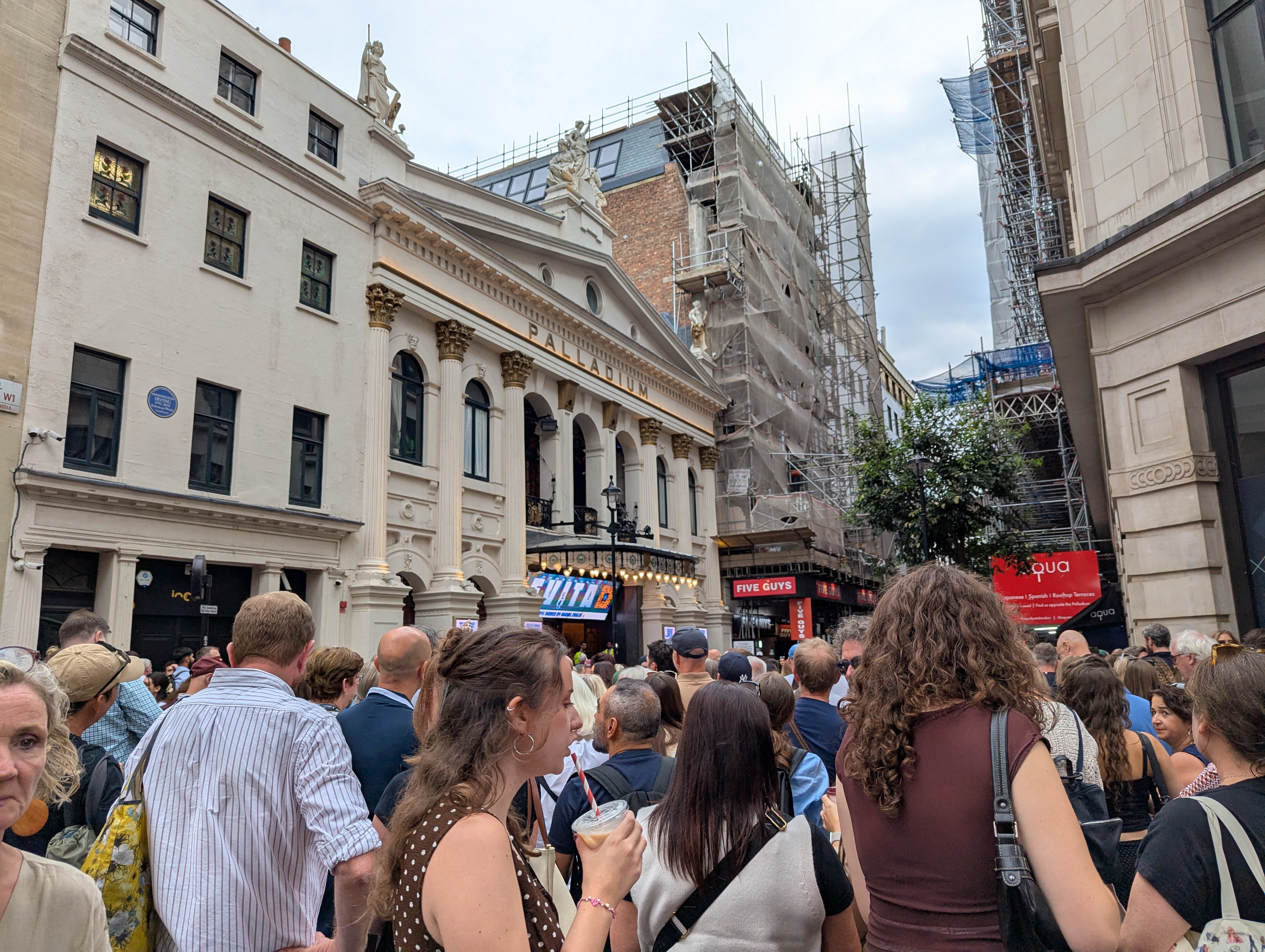 Our second peasant experience of the weekend was trekking over to the Palladium Theatre and seeing Rachel Zegler sing “Don’t Cry for Me Argentina” from the balcony during the matinee performance of Evita. She literally sings to a gathered crowd below the theatre balcony while, for paying customers inside the theatre, they stream live video of her doing this. When we arrived about an hour before the scene would occur there were already thousands gathered on Argyll Street. While we were waiting, the silly thing that kept coming to my mind was the old, comical sketch about Father Guido Sarducci’s Five Minute University, where he advocates for a college experience where he’ll teach you in five minutes only the things you’ll remember five years after you graduate. I know the outline of what happens in Evita, but literally the only song I’ve ever heard of in a musical of dozens of songs is “Don’t Cry for Me Argentina.” To be able to spend $0 hearing Rachel Zegler sing this song beautifully in 5 minutes in this amazing setting instead of watching the whole musical for $600+ is pretty great. I wasn’t prepared for how moving it would be. The video I linked above is not my video or from the day we were present, but it gives you an idea of the experience. I really wanted to be in the moment (and I was).