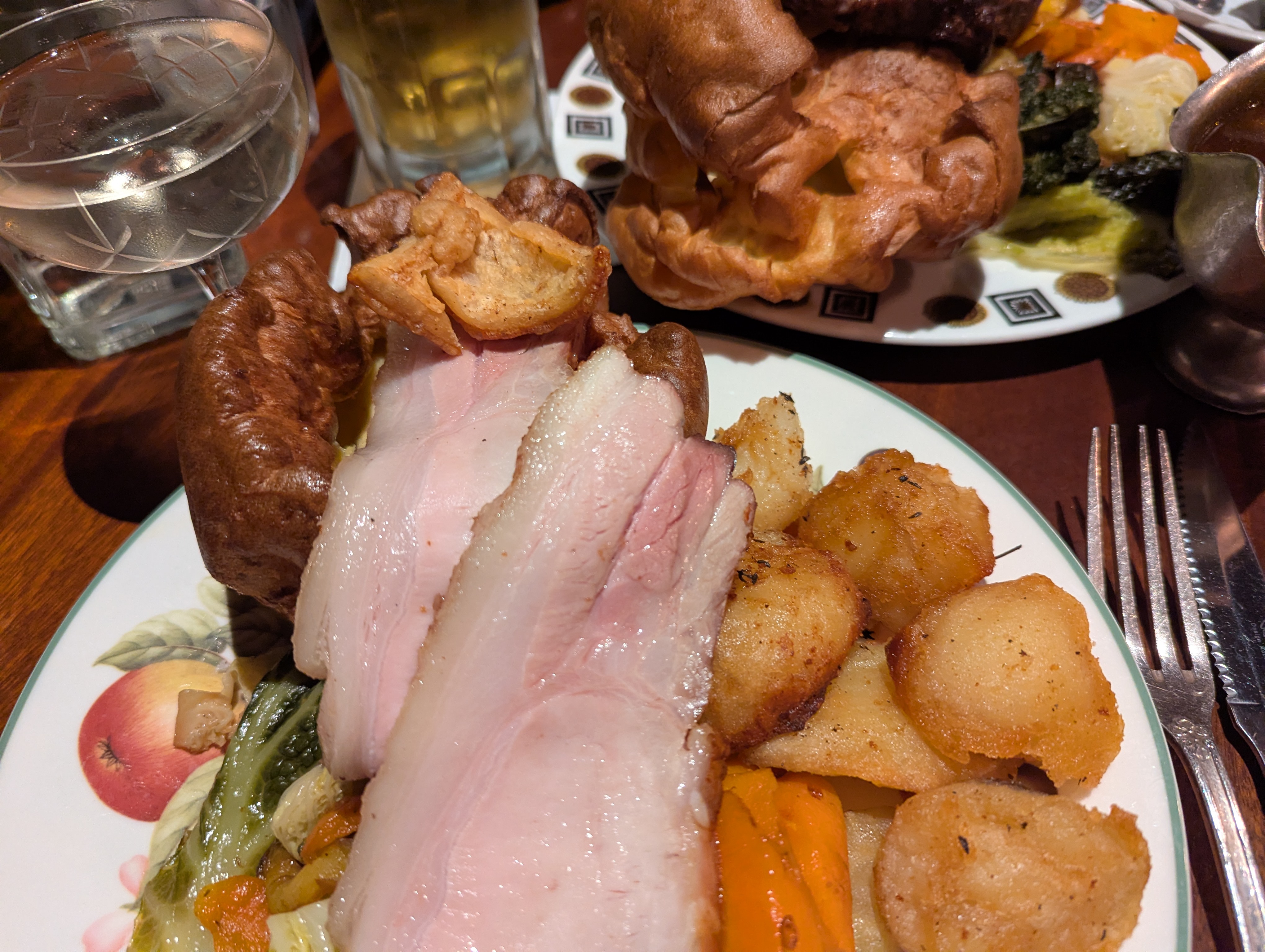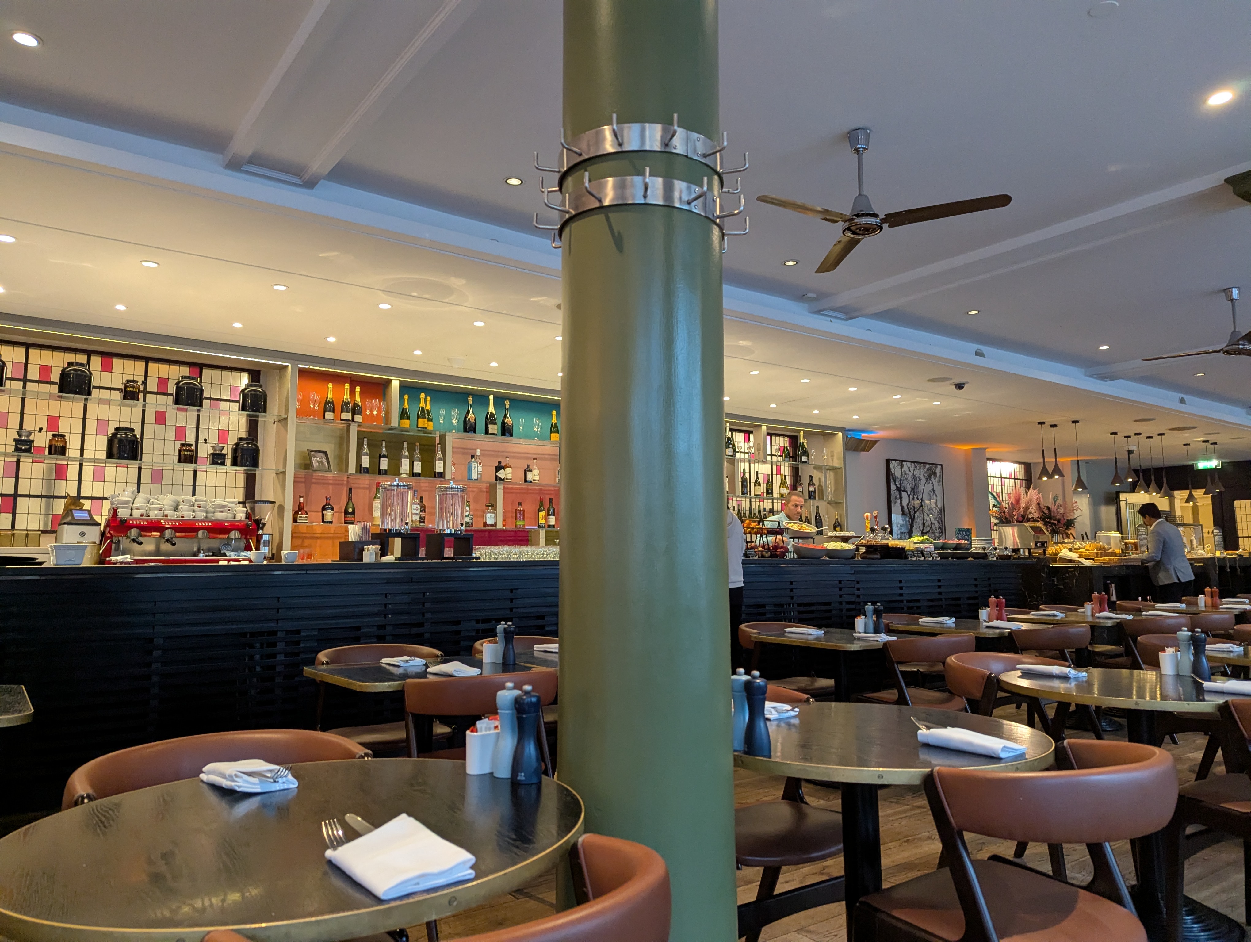 The location was great. Farringdon station was a block away, so it was easy to get where we wanted to go, and there was a good selection of coffee shops, restaurants, and pubs nearby. This was the first time we visited London where it was more convenient to take the Elizabeth line than the Piccadilly line to and from the airport. Have to say the Elizabeth line is an easy way to travel. New, spacious cars, and there was never a time when we had to schlep our stuff up a bunch of stairs. Hotel excepting. I only packed a carry-on, but a week’s worth of crammed-in stuff is still kind of heavy for a near-retiree.