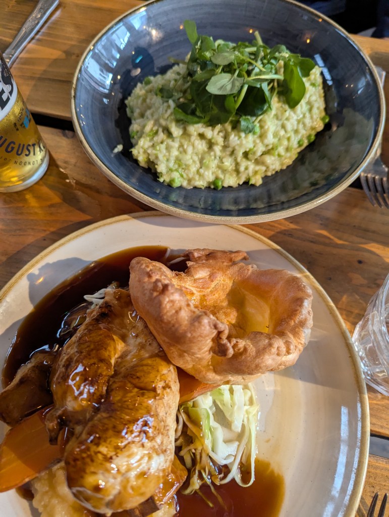 After the punt tour we walked around the city center some more and then returned to our hotel. They were still not quite ready to check us in and suggested that we get lunch at The Old Bicycle Shop, which was a few blocks away. This pub actually is in the same spot as a historic bike shop where supposedly Charles Darwin bought a bike in the 1800s. It was a Sunday so they did have Sunday Roast, which I happily ordered. My husband had risotto. We both had dessert, Eton Mess for me and Sticky Toffee Pudding for him.